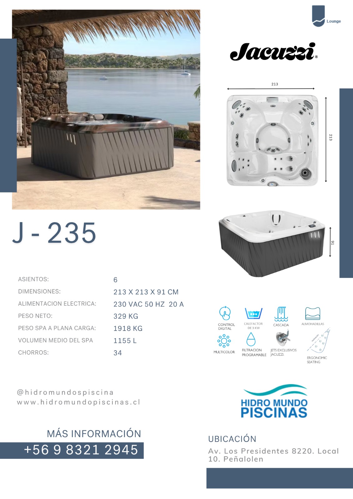 Utilizando materiales superiores y experiencia, en Jacuzzi® la tina de hidromasaje J-235 ™ ofrece un asiento tipo lounge, además de la calidad y el valor respaldados por la marca Jacuzzi®. Este modelo asequible y eficiente tiene capacidad para seis adultos cómodamente y ofrece hidroterapia de alto rendimiento a un buen precio, con jets ClassicPro ™ versátiles.