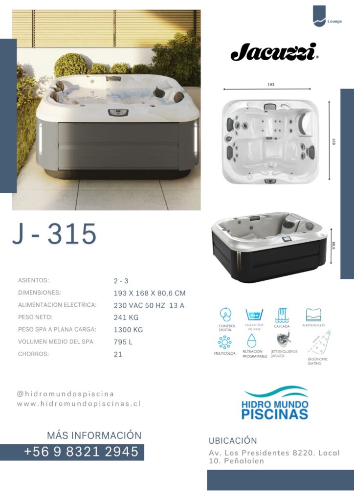 Con 3 opciones de asientos, el modelo J-315 ™ presenta una combinación de asientos semi-lounge combinados con asientos verticales, todos diseñados ergonómicamente para brindar comodidad en una tina compacta.
